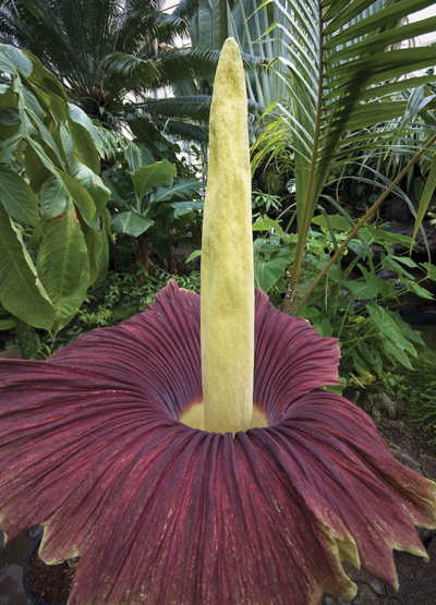 L'inflorescence de cette plante à records est typique de l'arum de nos jardins, sauf pour sa taille et ses caractéristiques, surtout olfactives. Tant de singularités rendent le végétal attractif et beaucoup de jardins botaniques la cultivent. La presse locale annonce une floraison à venir. Elle mesurera entre 1 et 3 mètres de haut mais ne durera pas plus de trois jours. La bractée enveloppante est de couleur viande. L'odeur s'apparente à celle d'une viande en décomposition. C'est cela qui attire mouches et coléoptères mangeurs de charogne. Leurs passages sur les éléments mâles et femelles de la fleur assurent la pollinisation et la production de graines donc.