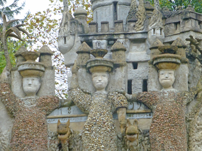 Cheval intégre à sa construction ses représentations imaginaires des hommes, des animaux, des architectures, des plantes... C'est son monde à lui qu'il tente de reproduire en associant pierres, galets, coquillages, chaux , tiges de fer et un peu de ciment pour tenir ses assemblages.