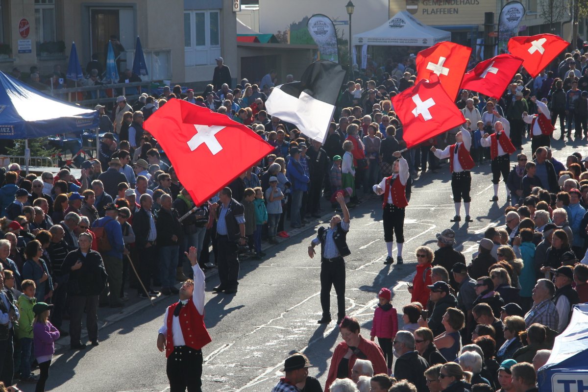 Cette année, la Grande Bénichon se déroulait près de Fribourg le dernier week-end de septembre à Planfayon, Plaffeien en allemand, puisque le village se trouve dans la partie germanophone du canton. La fête dans toute sa splendeur, car a lieu en même temps la Rindyà. Près de mille vaches de vingt-et-un troupeaux convergent de tous les alpages de la région vers le village. Devant chaque troupeau, les " armaillis ", gardiens des vaches, une canne à la main, coiffés d'un " capet ", chapeau de paille, portent le " bredzon " du dimanche, veste brodée d'edelweiss sur le col avec des manches courtes et bouffantes, et en bandoulière le " loyi ", sacoche de cuir contenant du sel destiné aux vache et de la graisse à traire.