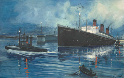 André GALLAND, Ile de France sortant du Port du Havre, 1931, gouache, 70,5 x 112,8 cm, collection particulière