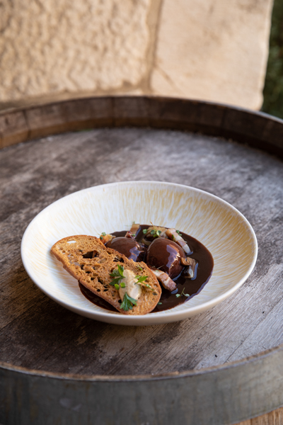 Étape 1 : Garniture meurette Couper le lard en allumettes Laver rapidement les champignons et les sécher Éplucher les petites échalotes Faire fondre 20 g de beurre dans un petit sautoir, ajouter les échalotes, le thym et le laurier, mettre le couvercle et cuire à court mouillement, les caraméliser et déglacer au vinaigre de vin. Débarrasser et réserver. Dans un autre sautoir, colorer les lardons. Faire cuire à couvert. Au terme de la cuisson, réserver la garniture au chaud. Cuire les champignons dans un fond de bouillon et les glacer légèrement Cuire les oignons grelots à blond. Ingrédients 24 Œufs extra frais de la ferme du Petit Nanteux Beurre Ail Sauce : 2l Vin rouge pinot noir de Bourgogne 50 cl Fond de volaille 50 g Couenne de lard de Mangalitza de la ferme du mont Morvan Garniture aromatique : Oignon, échalotte, carotte, poireau Bouquet garni : laurier, thym Baie de genièvre 20 g Foie de Volaille Beurre manié qs Sel et poivre en grain salé des côtes de Madagascar