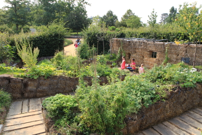 « Ce paysage agraire, nous l'avons réinventé, ré-enchanté. Il se veut innovant et sensible pour que renaissent dans nos assiettes goût, diversité, naturel et santé. Le tableau est composé de 4 collines successives, formée par des ballots de paille qui accueillent une grande diversité de plantes potagères. Nous entrons dans ce décor par le cadre du tableau et déambulons au cœur de ces collines au rythme des repas : « entrée », « plat », « dessert », « pain et vin ». Cette promenade réveille les sens et la conscience et par le réveil de notre corps et notre esprit face à notre assiette ce jardin potager propose une grande variété de plantes comestibles, aromates, fleurs, fruits, légumes.