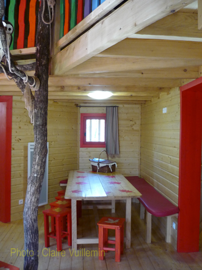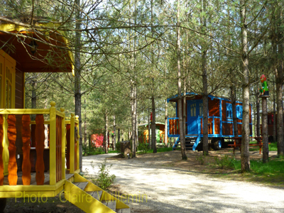 Le parc propose toute une palette d'hébergements originaux : des yourtes authentiques : ces drôles de huttes rondes et colorées vous dépayseront en préservant votre bien-être et votre repos. Les maisons dans les arbres sont bien agencées et spacieuses, vous y séjournerez tel un Robinson en récupérant tout de même votre petit déjeuner à la corde le matin... La maison poule, la maison lapin, les maisons champignon : il y en a pour tout les goûts. Les roulottes sont installées entre les arbres apportant des touches de couleurs agréables à l'oeil. Chaque hébergement est soucieux de préserver la nature : toilettes sèches, tri des déchets.