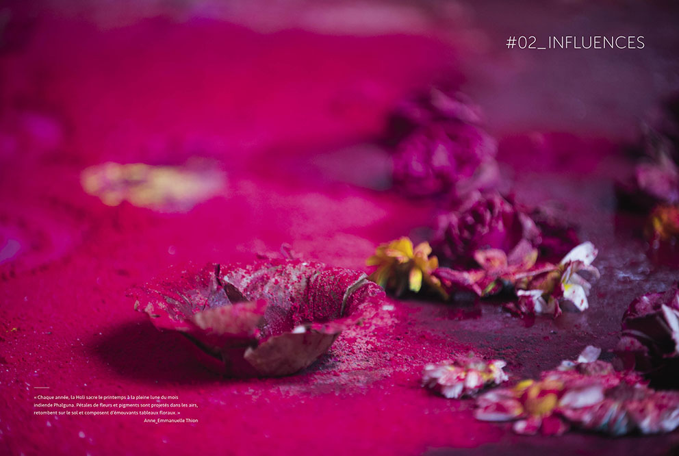 Chaque année, la Holi sacre le printemps à la pleine lune du mois indien de Phalguna. Pétales de fleurs et pigments sont projetés dans les airs, retombent sur le sol et composent d'émouvants tableaux floraux.
