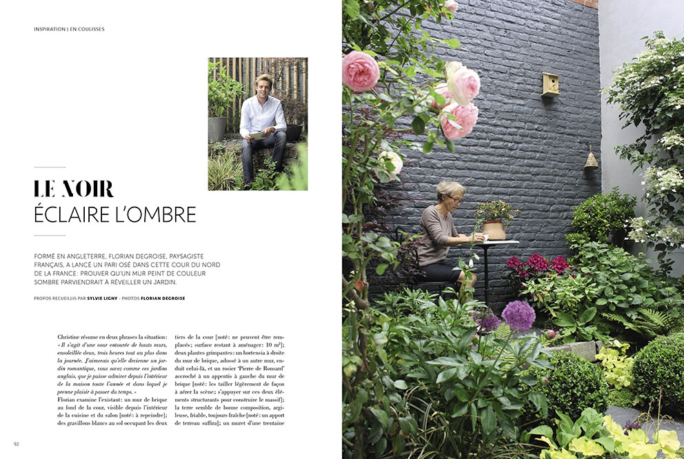 Et comme l'avenir sera bientôt entre les mains de nos jeunes créateurs d'aujourd'hui, Garden_Lab offre ses pages pour faire des présentations d'artistes encore pas ou peu connus. Dont Florian Degroise, paysagiste français formé en Angleterre, qui démontre dans une cour entourée de hauts murs qu'une couleur sombre la réveille et la sublime. Le reste est à la mesure dans l'innovation et le non conventionnel sur près de 180 pages.