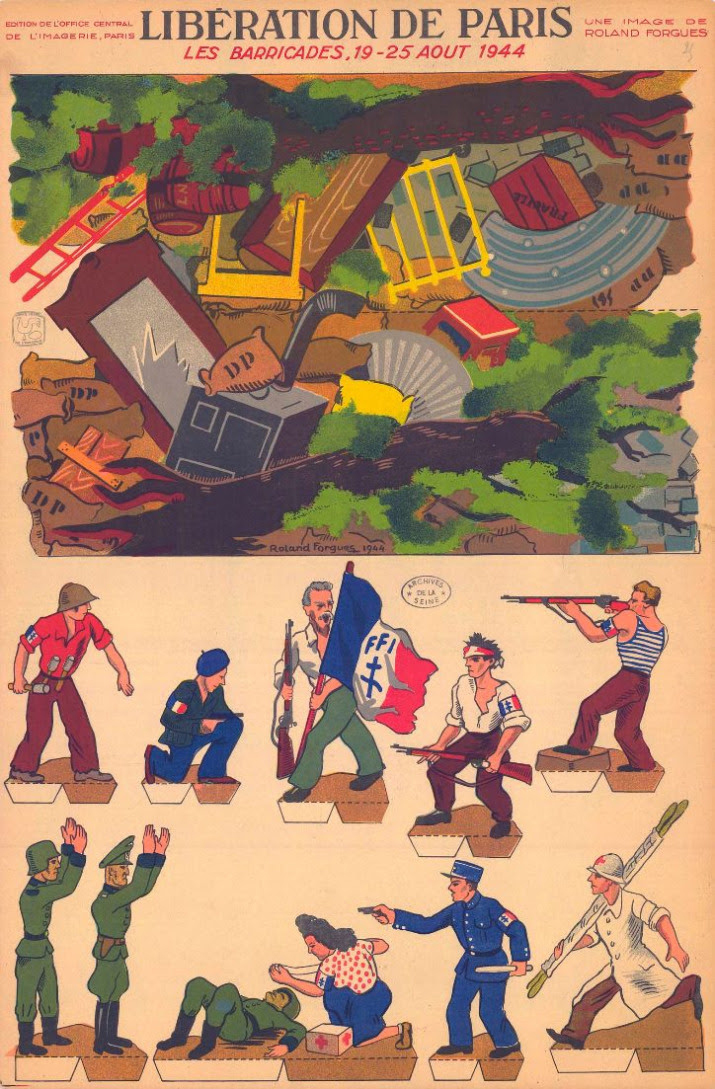 Jeu pour enfants consacré à la Libération de Paris - Les barricades (19-25 août 1944) : planche d'images à découper dessinées par Roland Forgues (1944) ©Archives de Paris, 6AZ 18(1)
