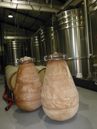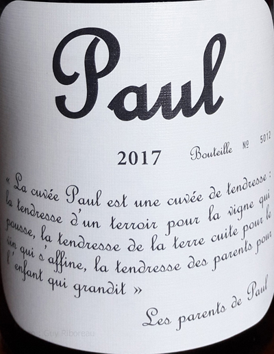 Prenons l'exemple de "Paul" (prénom d'un fils). C'est un 100% Cabernet franc  planté sur des calcaires blancs lacustres avec argiles. Rendement volontairement limité à 30 hectolitres/ha. Le jus est fermenté sans sulfite avec pigeages les premiers jours et remontages quotidiens ensuite. Une macération post fermentaire est réalisée à chaud (38°) pendant 10 jours sous marc. S'ensuit une macératon malolactique en cuve inox, puis, après soutirage, un élevage en jarres de 150 litres pour moitié de la cuvée et en foudre pour l'autre moitié. Filtration légère à plaque avant la mise en bouteille.