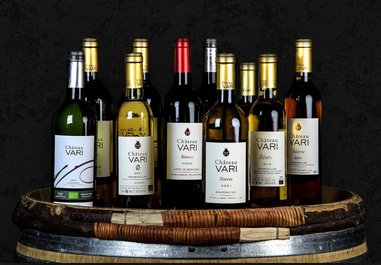 Le Bergeracois, c'est 12 appellations, des Côtes de Bergerac à celles de-Duras, en passant par celles de Montravel, Montbazillac et Pecharmant. S'y ajoutent la Rosette et le Saussignac. La Dordogne et ses aflluents irriguent la région qui apparait comme le prolongement naturel du Libournais voisin. Mêmes cépages : cabernet-sauvignon, cabernet franc, merlot pour les rouges, sauvignon, sémillon et muscadelle pour les blancs. L'assemblage est de rigueur pour les Bergerac. Le Château Vari situé à Montbazillac produit évidemment cette belle appellation mais également des Bergerac rouges, des blancs secs, des rosés et des moelleux, tous issus de l'agriculture biologique. Depuis 1994 le domaine de 24 ha est entre les mains de Sylvie et Yann Jestin qui l'ont converti au bio (et affiché une coccinelle symbolique sur le i de Vari !)