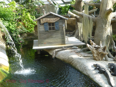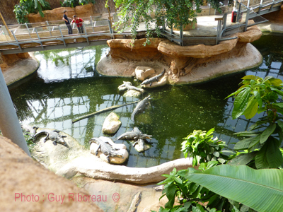 Sous une immense verrière où la température est régulée avec l'apport de l'eau de refroidissement de la centrale nucléaire de Civaux toute proche, ces rescapés des premiers âges coulent des jours paisibles dans une atmosphère tropicale. L'eau pour les crocodiles est à 27°. La végétation est luxuriante.