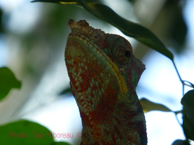 Quelques caméléons se promènent dans les arbres à la recherche de quelques insectes qu'ils attraperont prestement d'un coup de langue. précis.