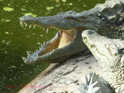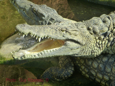 Gueule ouverte permettant de réguler leur température, les sauriens paressent en attendant l'heure du nourrissage. Contrairement aux idées reçues, leur appétit .est plutôt réduit. Ils mangent surtout des poissons. Les plus gros (+/- 5 mètres) peuvent s'attaquer à un zèbre ou une antilope.