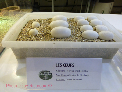 Les oeufs d'alligator du Mississipi (au centre) sont nettement plus gros que ceux du crocodile du Nil (à droite)