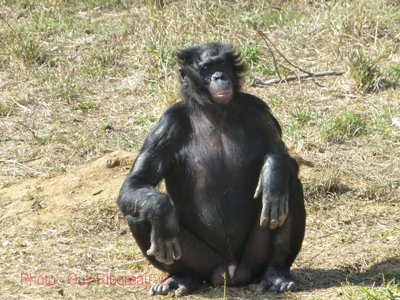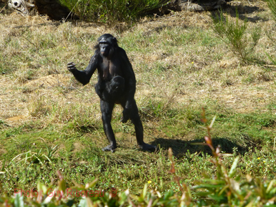 Les Bonobos,(ou chimpanzés pygmées) sont, en termes de génétique, le plus proches de l'être humain (98,7 %de gènes identiques). Ils sont largement bipèdes, mesurant jusqu'à un mètre de haut en position debout. Ils disposent à la Vallée des singes de plus d'un hectare et demi d'enclos et d'un vaste bâtiment de 900m2..