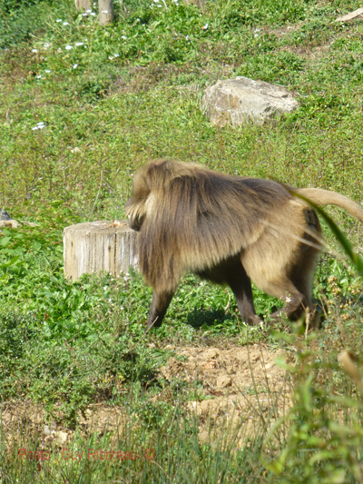 Les geladas ont de longues canines (6cm) qui leurs servent à se défendre lorsqu'ils sont attaqués Ils sont herbivores et passent leurs journées à brouter des brins d'herbe ou à chercher des racines. Le parc leur apporte des légumes et des graines en complément.