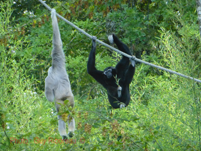 Les Gibbons sont monogames et ils ont plsieurs particularités. S'ils peuvent se déplacer en bipédie, ce sont les as du déplacement suspendu.en se balançant très vite d'une main à l'autre. Ils sont les seuls grands singes à ne pas se construire de nid et de plus, ils chantent ! Leur chant diffère entre mâle et femelle et ils chantent aussi ensemble. Une façon de marquer leur territoire et de dire aux autres "c'est nous et on s'aime" !