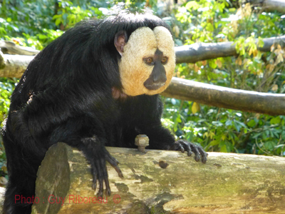 Curieux singe que le Saki à face blanche. C'est le mâle qui a cette sorte de masque blanc: la femelle a le visage gris avec 2 traits orangés