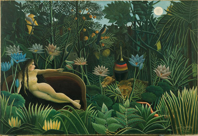 Toute une génération de surréalistes s'appropriera cette vision d'un monde primitif, cette nostalgie d'un paradis perdu. Autodidacte, Rousseau s'est essayé à tous les genres : portraits, natures mortes, allégories patriotiques, paysages de banlieue, jungles sublimes et terrifiantes.