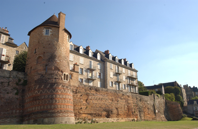 En pierre calcaire et grès roussard, liés par un mortier rose, l'enceinte a donné à la ville cette singulière tonalité rouge qui fait sa spécificité. Édifiée sous l'antiquité tardive en Gaule romaine, l'enceinte de 450 m de long sur 200 m de large, a protégé pendant plus de quinze siècles le noyau historique de la ville.