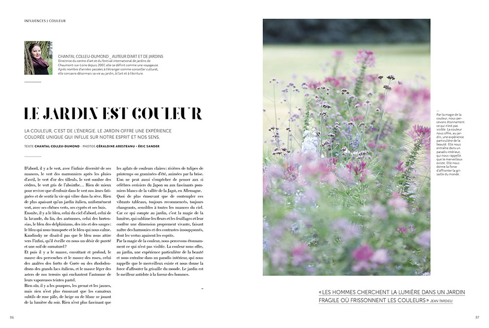 Qui féminisera la formule " à tout seigneur, tout honneur " ? Qu'importe ! Il était logique d'accorder une tribune à Chantal Colleu-Dumond, directrice depuis 2007 du Festival des Jardins de Chaumont-sur-Loire, tant elle a fait pour mettre cette manifestation en orbite. Elle aussi évoque la couleur au jardin avec l'expérience qu'elle a acquise à l'occasion de longs séjours à l'étranger en qualité de conseiller culturel. Elle évoque poétiquement le vert d'or des tilleuls, le vert gris de l'absinthe. Après avoir passé en revue les bleus qu'elle se plait à nommer : ceux de la lavande, du lin, des hortensias, des delphiniums, elle évoque le bleu qui nous transporte, le bleu qui nous calme. Et même Kandinsky parlant du bleu qui attire vers l'infini et qui éveille en nous un désir de pureté et une soif de surnaturel. Chantal nous propose ainsi une jolie lettre pleine de poésie.