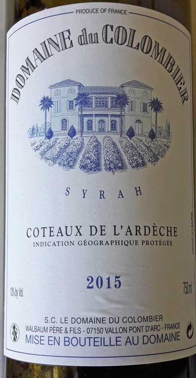 Ardéche Rondeur, suavité, belle longueur en bouche pour ce Coteaux de l'Ardéche 2015, 100% Syrah du Domaine du Colombier qu'on voit bien sur des brochettes de veau aux épices; un magret de canard.