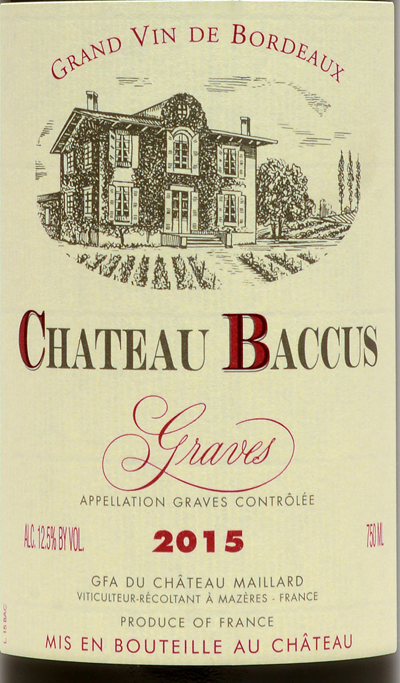 Bordeaux Ce Graves de Vayres 2015 du Château Bacchus (orthographié Baccus sur l'étiquette !) composé de Merlot (80%) et de Cabernet s'avère parfait sur des viandes blanches, une noix de veau par exemple, grâce à sa souplesse et ses tanins fondus. Bon rapport qualité-prix (chez Franprix) : 5,99€