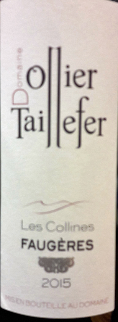 Faugères le Domaine Ollier-Taillefer est un des domaines chez lesquels la qualité prime. Les collines font partie des belles cuvées du Domaine et en millésime 2015 offrent une douceur et un fruité surprenants. Un vin à boire dès maintenant .légèrement frais sur des charcuteries et des viandes blanches.