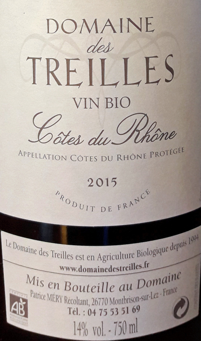 Côtes du Rhône ter : Au Domaine des Treilles en Drôme provençale, on fait du vin depuis 1772. A partir, pour les rouges, de Grenache et de Syrah, cultivés en Bio. Leur Côtes du Rhône 2015 est charnu et souple à la fois, même s'il pourrait vieillir encore 3 à 5 ans sans problème. A boire à 14° sur des plats provençaux fleurant bon le thym et le serpolet..