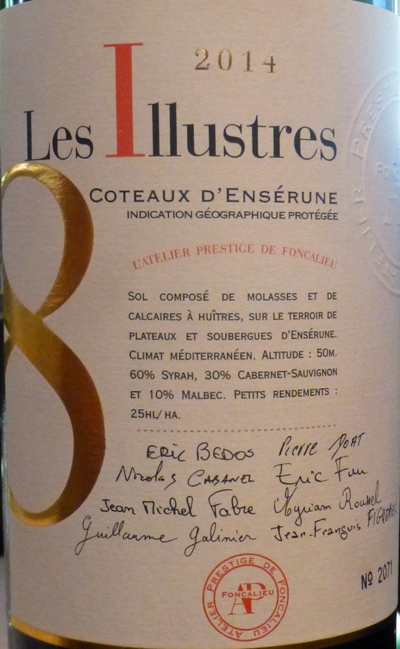Coteaux d'Ensérune Vignobles de Foncalieu : Cuvée Les Illustres, un IGP 2014, bel assemblage de 60% de Syrah, 30% de cabernet sauvignon et 10% de Malbec. Un vin tanique, légérement boisé, avec une belle structure, des épices, élaboré par huit vignerons passionnés. Il sera parfait sur un gibier ou une côte de boeuf bien persillée. (19,90€)