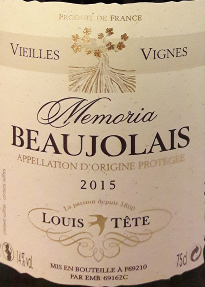 Beaujolais Louis Tête Memoria Reflet des pierres dorées 2015. Un bon Gamay aux saveurs de fruits rouges, de poivre, gourmand et vif. Parfait sur un jambon de Bourgogne et des petits rillons de Touraine (11,90 €).