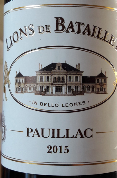 Château Batailley : un Pauillac, Lions de Batailley 2015 qui fait référence aux deux superbes lions qui gardent le portail de la cour d'honneur du château. Un vin issu d'une majorité de Cabernet Sauvignon, cépage idéal qui s'épanouit parfaitement sur le sol de graves de Batailley, associé avec des Merlot. C'est un vin qui se déguste parfaitement jeune mais sait aussi très bien vieillir. Assemblage 2015 : Cabernet Sauvignon 60%, Merlot 33%, Cabernet Franc 6%, Petit Verdot 1%. De la structure et de la finesse. Un Pauillac d'une grande élégance qui, servi à 14°C, accompagnera l'agneau, les gibiers, et les fromages crémeux. (Prix TTC recommandé : 30 euros sur www.lagrandecave.fr et chez les cavistes).