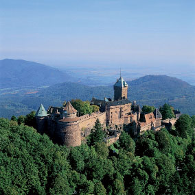 Edifiée au XIIème siècle par le duc de Souabe, Frédéric de Hohenstaufen puis possession des Habsbourg, la forteresse est saccagée par les Suédois pendant la guerre de Trente Ans. Abandonnée pendant plus de deux siècles, elle entre, en 1865, avec la forêt voisine, sous l'impulsion de Prosper Mérimée dans le patrimoine de la ville de Sélestat. Que faire, dans une Alsace annexée, d'une ruine qu'admirent les Romantiques mais dont la reconstruction semble inabordable? La ville décide, en 1899, de l'offrir à un homme aussi puissant que fortuné: Guillaume II de Hohenzollern, empereur d'Allemagne. Pour le kaiser qui accepte avec empressement, ce cadeau marque le retour de l'Alsace au monde germanique. Après les Hohenstaufen et les Habsbourg, il est lui, dit-il le Hohenzollern, le troisième "H "...Puisant dans sa cassette personnelle, l'empereur en confie la restauration à l'architecte Bedo Ebhardt.