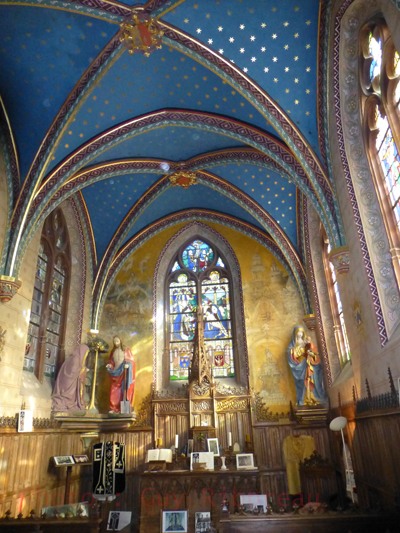 Plafond à feuilles d'or, très anciennes statues de bois et de pierre, vitraux du XVe siècle remarquablement restaurés, la chapelle à elle seule vaut la visite.