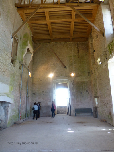 La photo montre deux salles superposées (avec leurs cheminées) dont le plancher disparu est en voie de reconstruction.