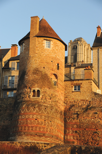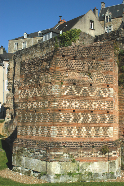 En pierre calcaire et grès roussard, liés par un mortier rose, l'enceinte a donné à la ville cette singulière tonalité rouge qui fait sa spécificité. Édifiée sous l'antiquité tardive en Gaule romaine, l'enceinte de 450 m de long sur 200 m de large, a protégé pendant plus de quinze siècles le noyau historique de la ville.
