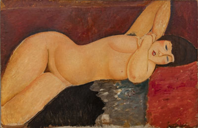 En 1916, le Polonais Leopold Zborowski devient le second marchand de " Modi ". On lui doit la première et seule exposition personnelle du peintre, Galerie Berthe Weill. Les quatre nus exposés (les poils pubiens sont apparents) font scandale et sont saisis lors du vernissage par la police pour outrage à la pudeur. Les invités aideront à décrocher les autres toiles de cette manifestation avortée. Inscrit aux Ecoles libres du Nu à Florence puis à Venise, Modigliani a manifesté dès son plus jeune âge un vif intérêt pour ce genre, témoin ce superbe " Nu couché ", un prêt de la Pinacothèque Agnelli de Turin.