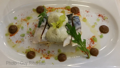 Dans le même registre de la fraîcheur marine, on trouve ce maquereau mariné, rémoulade de céleris, émulsion pomme granny et roquette, qui s'avère étonnament complexe. Un Condrieu blanc puissant saura l'accompagner dignement.
