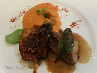 On trouvera à ce chapitre une poitrine de porc laquée aux épices, pluma ibérique de Metzger,accompagnée d'un aimable purée de patate douce qu'éveillera un Vacqueyras rouge du Domaine Montirius, Cuvée Garrigues 2013, la bien nommée.